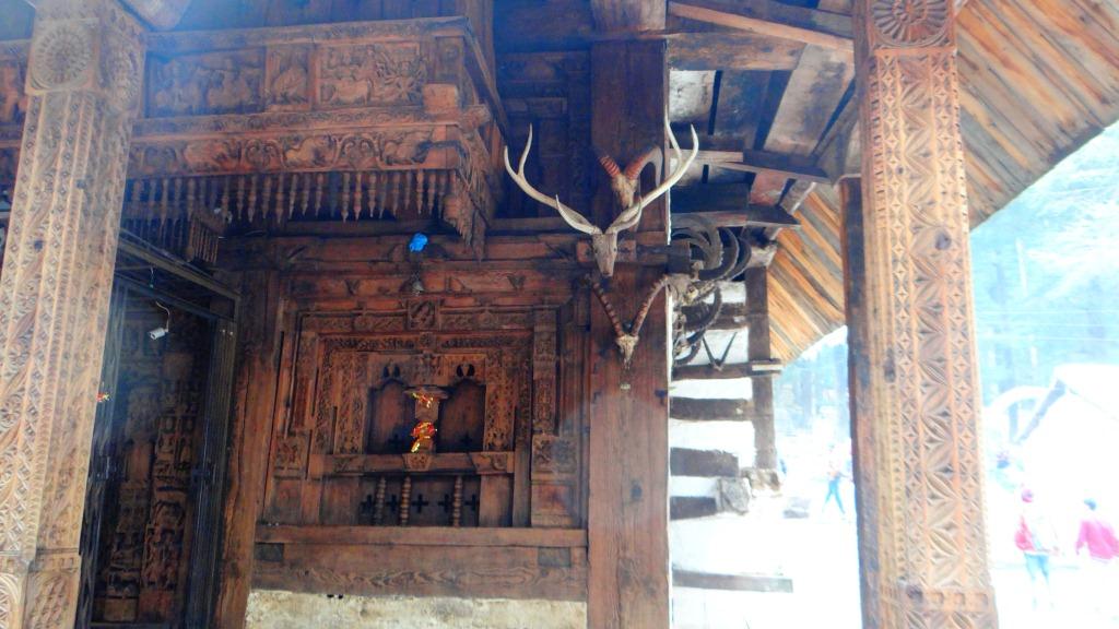 3 നിലപോലെ ആണ് അത് പണിഞ്ഞെക്കുന്നത്. പടി കയറി വേണം അമ്പലത്തിന്റെ അടുത്തെത്താൻ. റൂഫിനു മുകളിൽ കുറച്ചു മഞ്ഞു വീണു കിടപ്പുണ്ട്. കുമ്മായം തേച്ച ചുവരുകൾ ആണ്. ചുവരിൽ തടിയുടെ പ്ലാങ്കും , മൃഗങ്ങളുടെ തലയോട്ടിയും കൊത്തുപണികളും കൊണ്ട് അലങ്കരിച്ചിട്ടുണ്ട്. നമ്മുടെ നാട്ടിലെ തടിയിൽ ചെയ്യുന്ന കൊത്തുപണിയിൽ നിന്നും തികച്ചും വ്യത്യസ്ഥമാണ് അവരുടെ കൊത്തുപണി. ഞാൻ ഫോട്ടോ എടുക്കാനായി ചെന്നപ്പോൾ ഒരു അമ്മൂമ്മ കയ്യിൽ കുറെ പൂക്കളും ആയി അവിടെ നില്പ്പുണ്ടായിരുന്നു. ഫോട്ടോ എടുക്കാൻ ആണെന്ന് മനസ്സിലായപ്പോൾ മുഖത്ത് കെട്ടിയിരുന്ന ഒരു തുണി താഴേക്കാക്കി ചിരിച്ചു കൊണ്ട് അവർ നിന്നു. ഫോട്ടോ എടുത്തിട്ട് thumps up ചെയ്തു കൊള്ളാം എന്ന് കാണിച്ചപ്പോൾ അവർക്ക് സന്തോഷമായി. അടുത്ത ഭാഗത്തേക്ക് ഫോട്ടോ എടുക്കാൻ നീങ്ങിയപ്പോൾ പിന്നെയും ദേ വന്നു നില്ക്കുന്നു അവിടെയും.. ഓഹോ അപ്പോഴാണ് മനസ്സിലായത് അവര്ക്ക് ഫോട്ടോ പ്രാന്താണ്. ആര് ഫോട്ടോ എടുക്കുന്നത് കണ്ടാലും പോയി പോസ് ചെയ്തു നില്ക്കുന്നുണ്ട്. അമ്പലത്തിന്റെ വെളിയിൽ സൈഡിൽ ആയി ഒരു പാറകൂട്ടം ഉണ്ട്. എല്ലാരും അവിടെ കയറി ഇരുന്നു ഫോട്ടോ എടുക്കുന്നതിന്റെ തിരക്കിൽ ആണ്. ചുറ്റി നടന്നു കണ്ടതിനു ശേഷം അവിടെ നിന്നും അടുത്ത destination ആയ നാഗ്ഗർ castel ഇലേക്ക് യാത്ര തിരിച്ചു. ഹടിംബ temple ൽ നിന്നു 2.5km ദൂരെ മനു temple ഉണ്ട്. മനു temple നിന്നും vashisht എന്ന temple 4km ദൂരവും ഉണ്ട്. vashisht temple ഇന്റെ അടുത്തുള്ള ഹോട്ട് വാട്ടർ സ്പ്രിംഗ് വളരെ ഫേമസ് ആണ്. ഞങ്ങൾ അതിനു പകരം മനികരൻ ആണ് തിരഞ്ഞെടുത്തത്. അവിടെയും ഹോട്ട് വാട്ടർ സ്പ്രിംഗ് ഉണ്ട്.